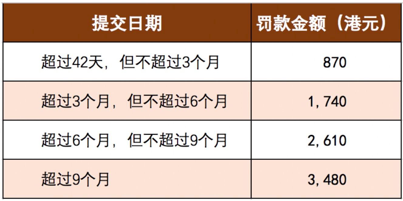逾期42天-3個(gè)月的,將被處以870港幣的罰款,以后每三個(gè)月累計(jì)增加870元罰款,逾期超過9個(gè)月,公司在收到罰單的同時(shí)還會(huì)被起訴。